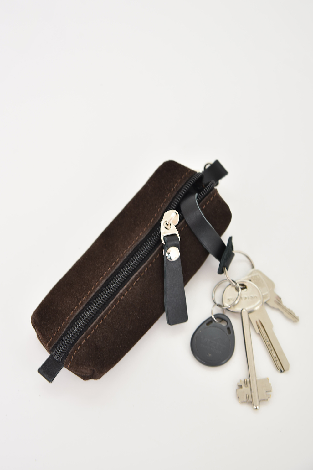 Ключница из натуральной кожи. Застегивается на молнию и имеет одно отделение. Чехол имеет внешнее крепление на карабин. Пуллер молнии выполнен из кожи. Внутри чехол имеет кольцо для крепления ключей на кожаной петле. 5х13х3 см
