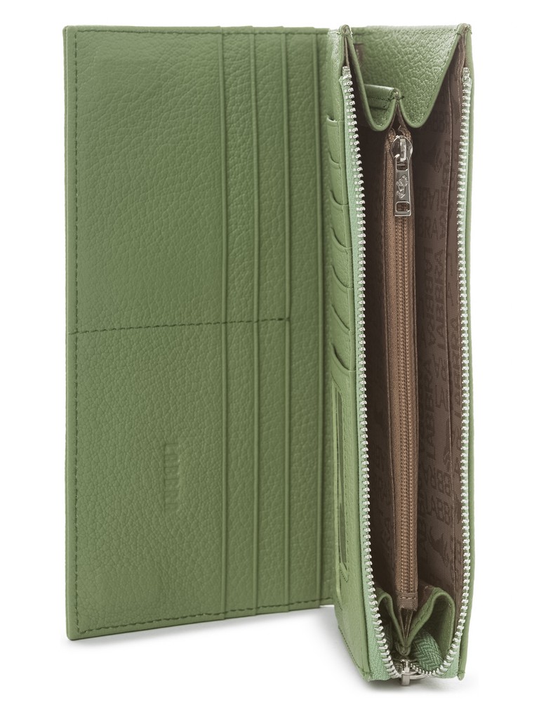 Женский кошелек торговой марки LABBRA из натуральной кожи. В кошельке два основных отделения, Одно отделение закрывается на металлическую молнию и внутри имеет 2 отделения и 2 дополнительных плоских кармана для купюр и одно отделение для мелочи, которое закрывается на дополнительную пластиковую молнию. Второе основное отделение закрывается на два скрытых магнита и внутри имеет 4 плоских кармана для купюр и 13 карманов для кредитных карт. Кошелёк имеет съёмную ручку-петлю на карабине высотой 15см.