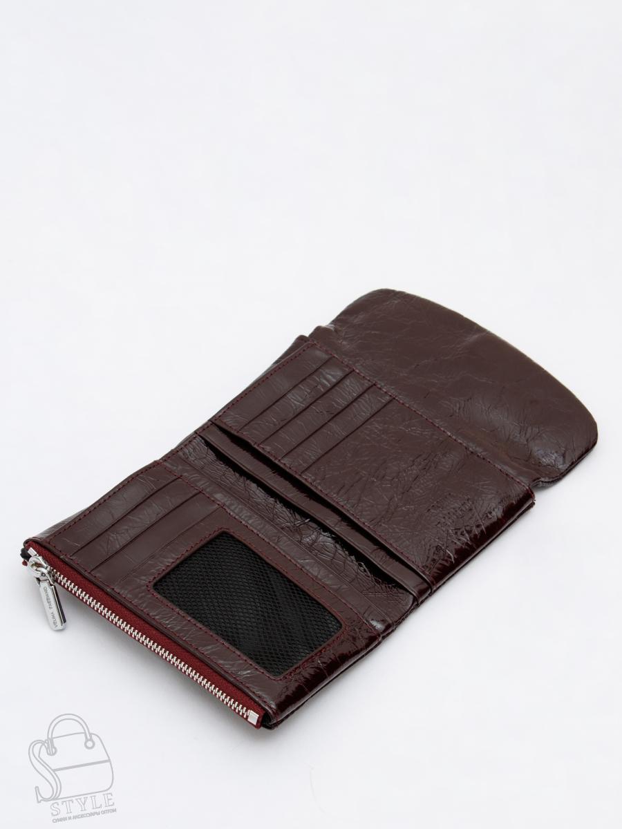 Кошелек женский из натуральной кожи. Модель раскладывается пополам, внутри открытый отдел под купюры, одиннадцать карманов для визиток и пластиковых карт, карман под клапаном. Снаружи клапан на магните и карман на молнии. Фурнитура блестящее серебро.