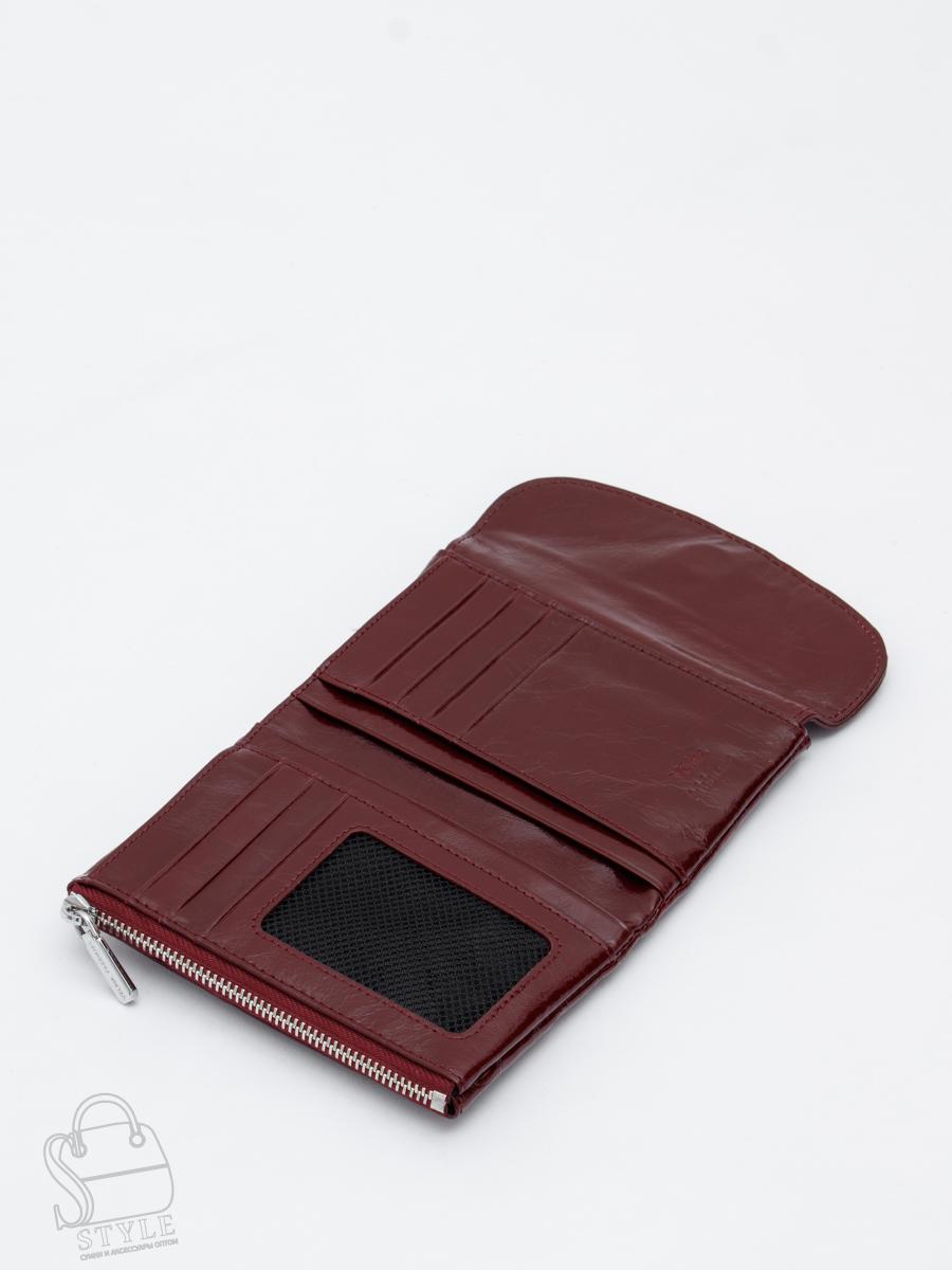 Кошелек женский из натуральной кожи. Модель раскладывается пополам, внутри открытый отдел под купюры, одиннадцать карманов для визиток и пластиковых карт, карман под клапаном. Снаружи клапан на магните и карман на молнии. Фурнитура блестящее серебро.
