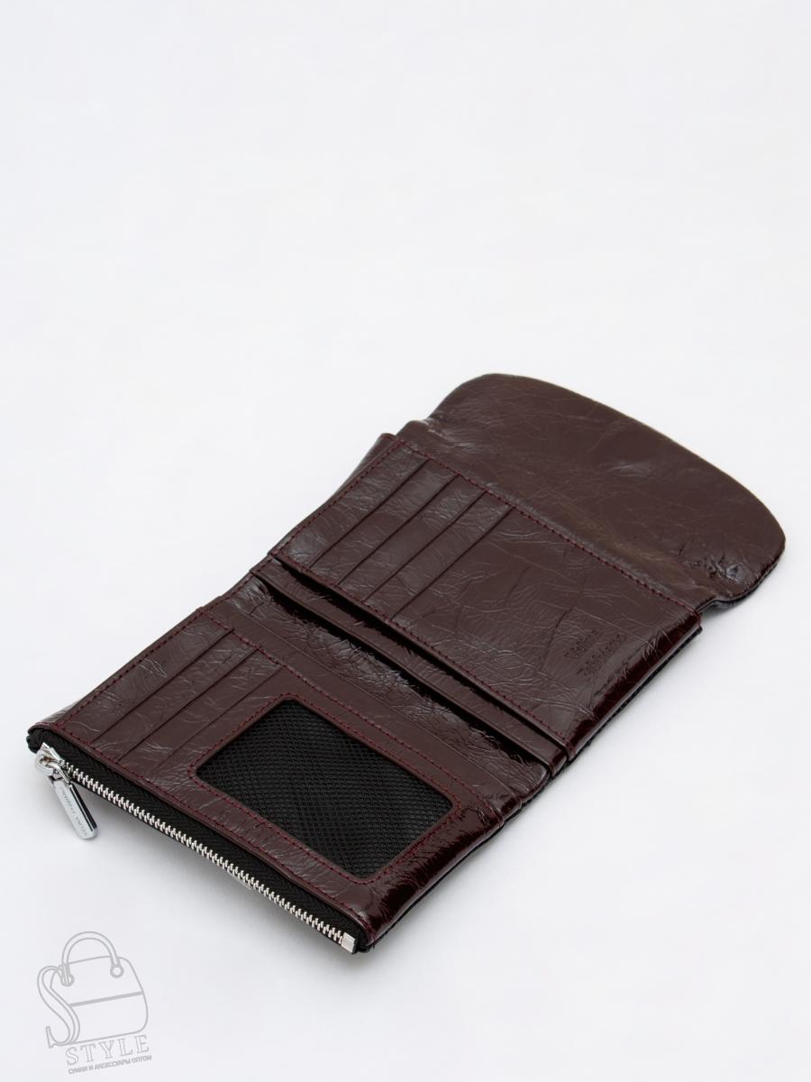 Кошелек женский из натуральной кожи. Модель раскладывается пополам, внутри открытый отдел под купюры, одиннадцать карманов для визиток и пластиковых карт, карман под клапаном. Снаружи клапан на магните и карман на молнии. Фурнитура блестящее серебро.