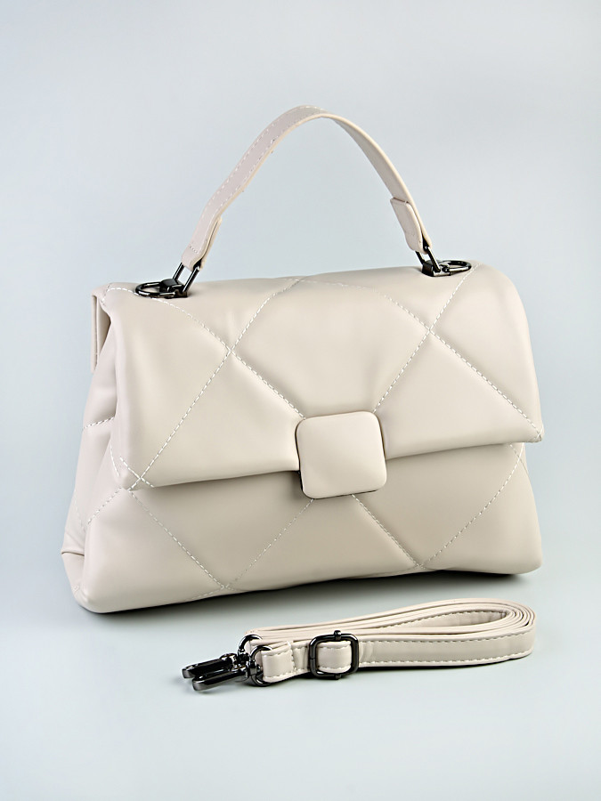 Сумка плотно закрывается спереди, «крышка-клапан» закрепляется с помощью магнитной кнопки. Сумка имеет два основных отделения на молнии, также два внутренних кармашка, один на молнии и второй открытых карман. Имеется длинный регулирующий ремешок. Каждая деталь прочно закреплена и хорошо сочетается с основным материалом модной сумки. Благодаря второй ручке её удобно носить в руке. Хорошо смотрится как зимой, так и летом. Её внешний вид подчеркивает любую верхнюю одежду – строгую куртку, элегантное пальто, жилет или повседневный бомбер.
