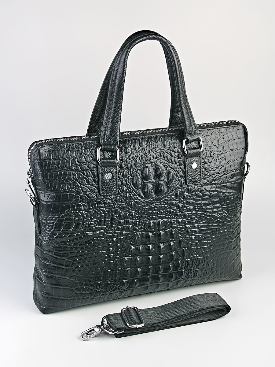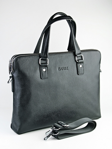 Портфель имеет основной большой отдел на молнии и отделение для документов. На лицевой стороне тиснение. Есть карман на молнии с тыльной стороны. Плечевой ремень регулируется по длине. Носить портфель можно как в руке, благодаря ручке, расположенной сверху, так и через плечо.