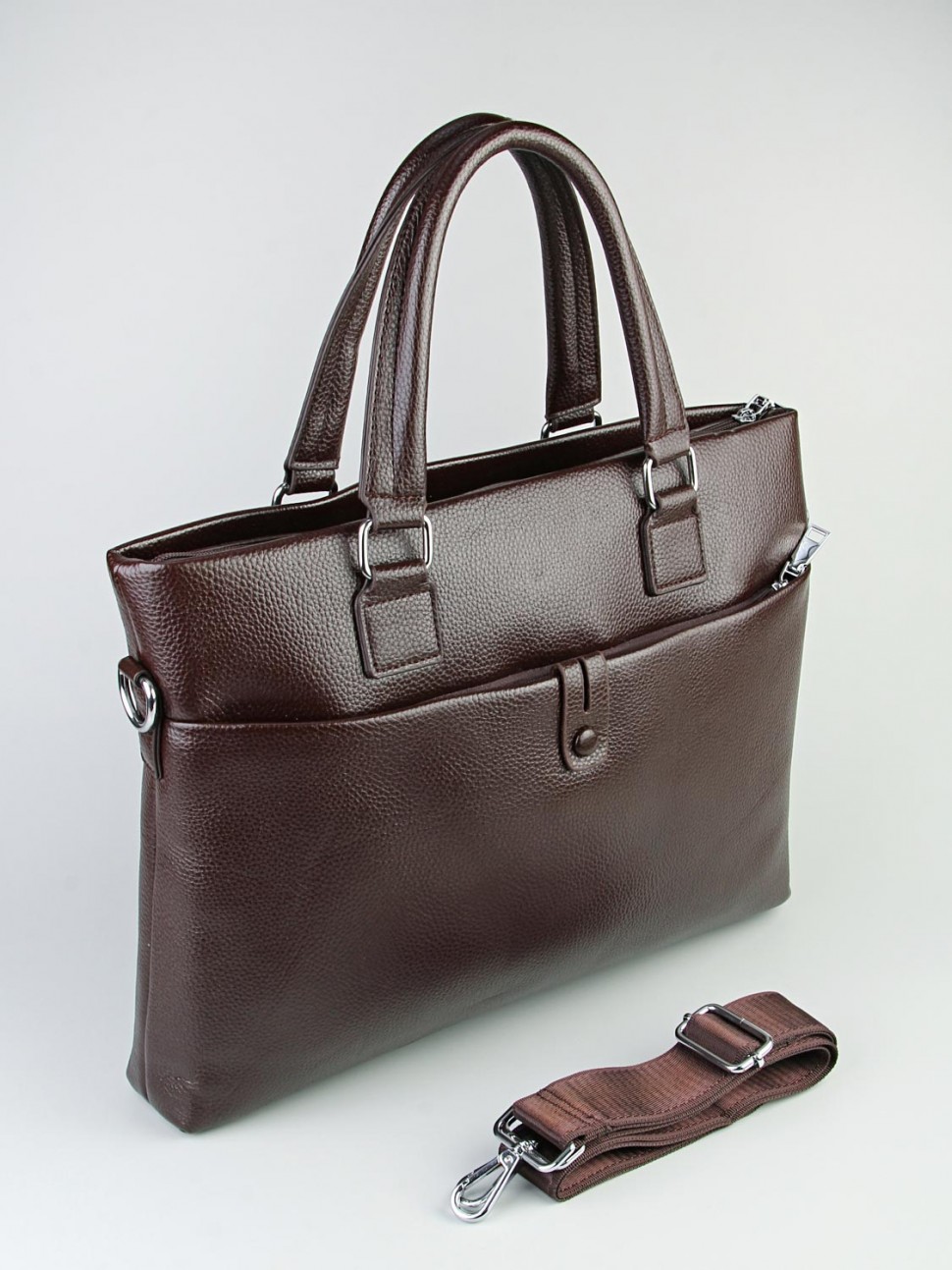 Портфель имеет основной большой отдел на молнии и отделение для документов. С лицевой и с тыльной стороны дополнительные карманы на молнии. Плечевой ремень регулируется по длине. Носить портфель можно как в руке, благодаря ручке, расположенной сверху, так и через плечо.