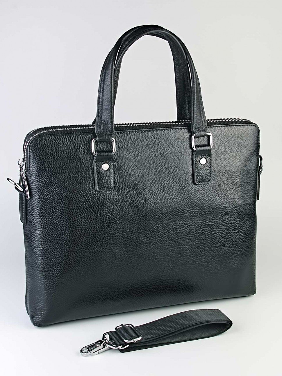 Портфель имеет два основных отделения. Есть карман на молнии с тыльной стороны. Плечевой ремень регулируется по длине. Носить портфель можно как в руке, благодаря ручке, расположенной сверху, так и через плечо.