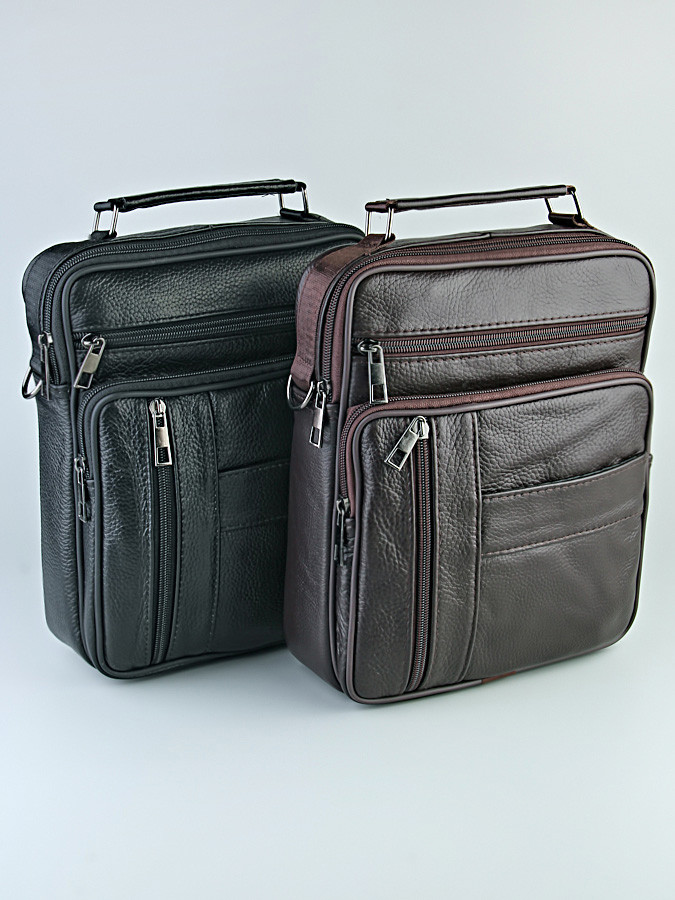Сумка выполнена из натуральной кожи. Имеет одно основное отделение, три кармана на молнии на лицевой стороне и потайной кармашек внутри. С тыльной стороны еще два кармана на молнии. Носить сумку можно как в руке, благодаря ручке, расположенной сверху, так и через плечо. Практичная и удобная в использовании мужская барсетка, создана, чтобы носить с собой только самые необходимые вещи: паспорт, документы для авто, мобильный телефон, ключи и пр.
