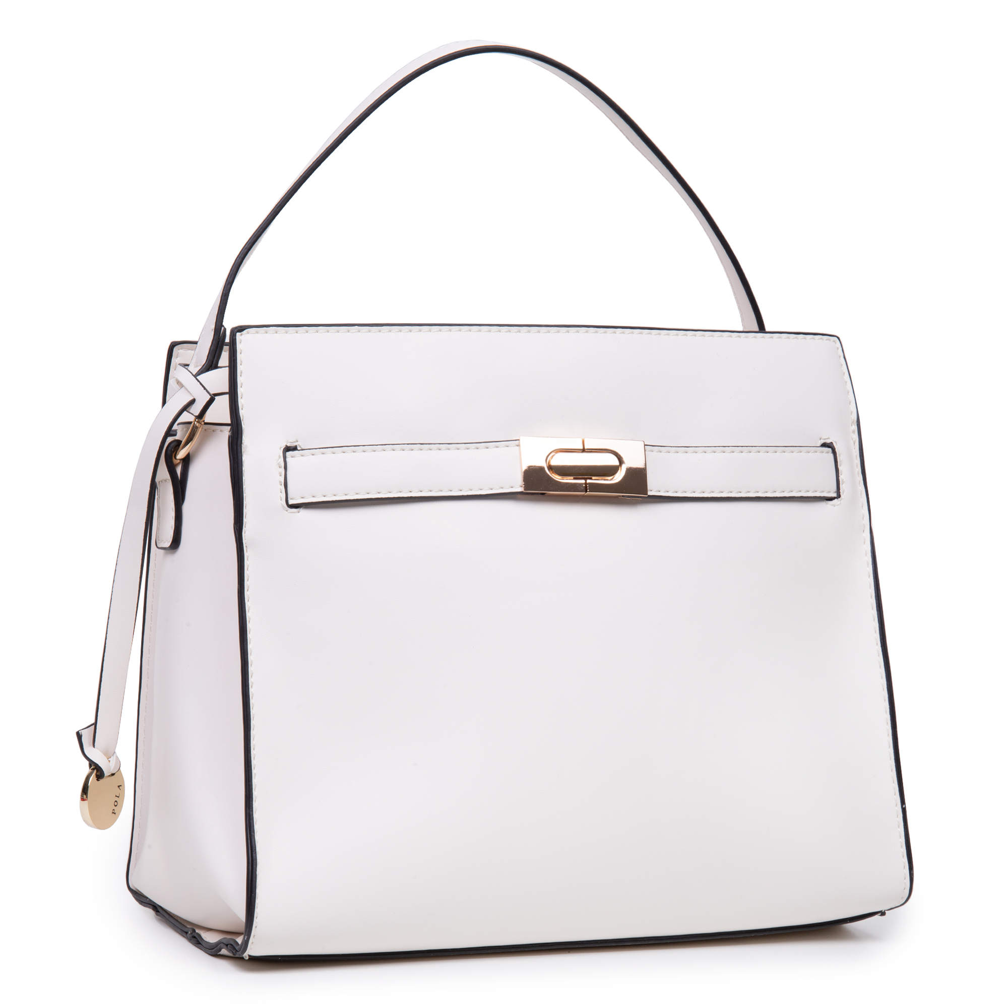 Стильная классическая сумка фирмы Pola выполнена из экокожи. Спереди есть карман закрывается на металлический замок. Основное отделение закрывается на молнию, внутри есть один карман на молнии и один открытый кармашек. Сумка прекрасно подойдёт женщинам, которые предпочитают деловой стиль. У сумки есть ручка для переноски, высота которой 13 см и съёмный, нерегулируемый плечевой ремень, максимальная длина которого 96 см. Цвет фурнитуры-золото.