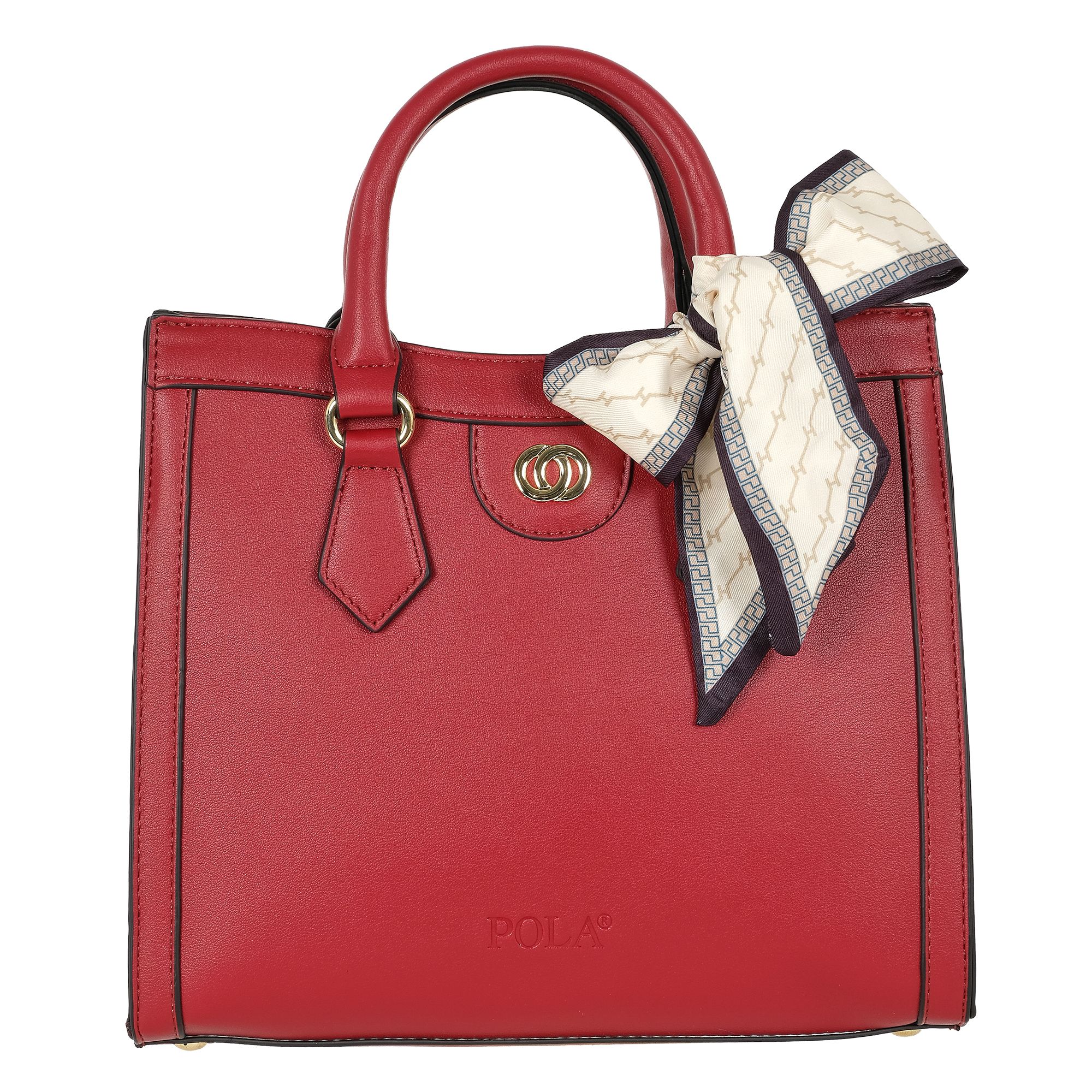 Модная сумка Pola выполнена из экокожи и украшена платком. Сумка прекрасно подойдёт женщинам, предпочитающим деловой, классический стиль. Основное отделение закрывается клапаном на магнитной кнопке. Внутри небольшой открытый кармашек. Сумку можно носить как в руках с помощью двух ручек, высота которых составляет 12 см, так и на плече с помощью съёмного регулируемого ремня длина которого- 115см. Цвет фурнитуры-золотой.