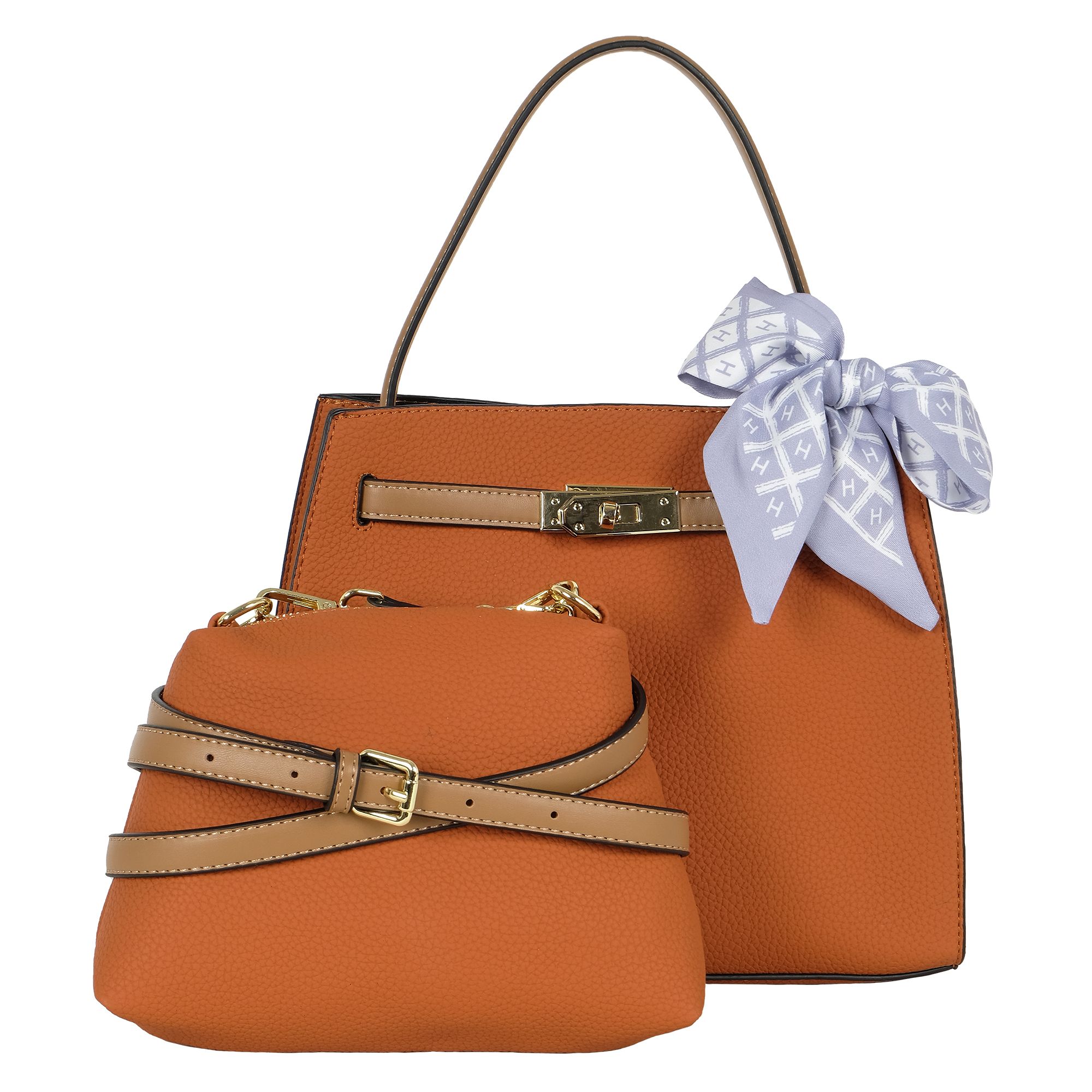 Стильная женская сумка фирмы Pola выполнена из экокожи и украшена платком. Основное отделение закрывается на металлический поворотный замок. Особенность модели состоит из сумки и кросс-боди, можно носить как самостоятельную сумку. Закрывается на металлическую молнию. Внутри сумочки кросс-боди маленький карман на молнии. Высота ручки для переноски, высота которой составляет 14 см и один съёмный ремешок длина которого 115. Цвет фурнитуры-золото.
