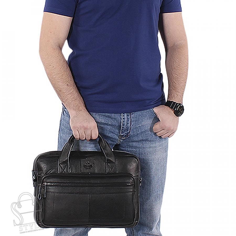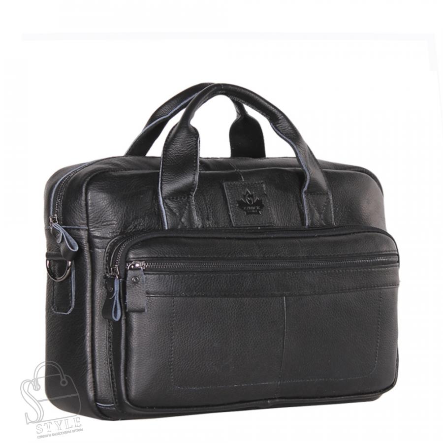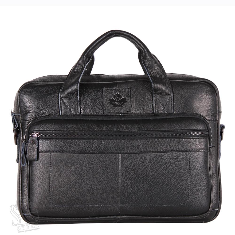 Мужской портфель выполнен из натуральной кожи. Дополнен  фурнитурой темное серебро. Данная модель закрывается на молнию. Каркас полужесткий. Носится в руке за встроенные ручки или на плече. В комплекте имеется съемный ремень.