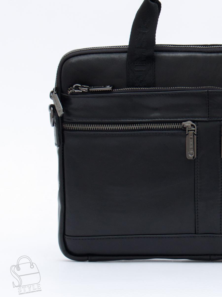 Мужской портфель выполнен из натуральной кожи. Дополнен  фурнитурой темное серебро. Данная модель закрывается на молнию. Каркас полужесткий. Носится в руке за встроенные ручки или на плече. В комплекте имеется съемный ремень.