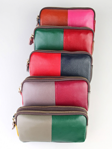 Косметичка выполнена из лоскутков натуральной кожи.