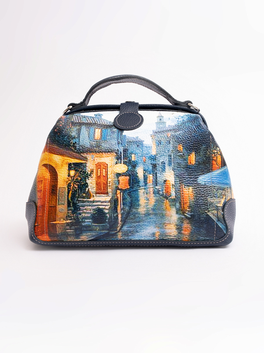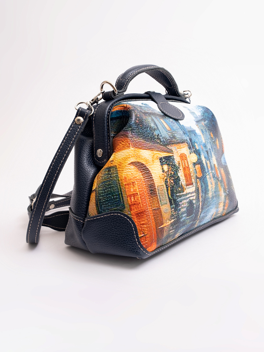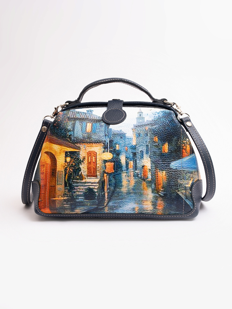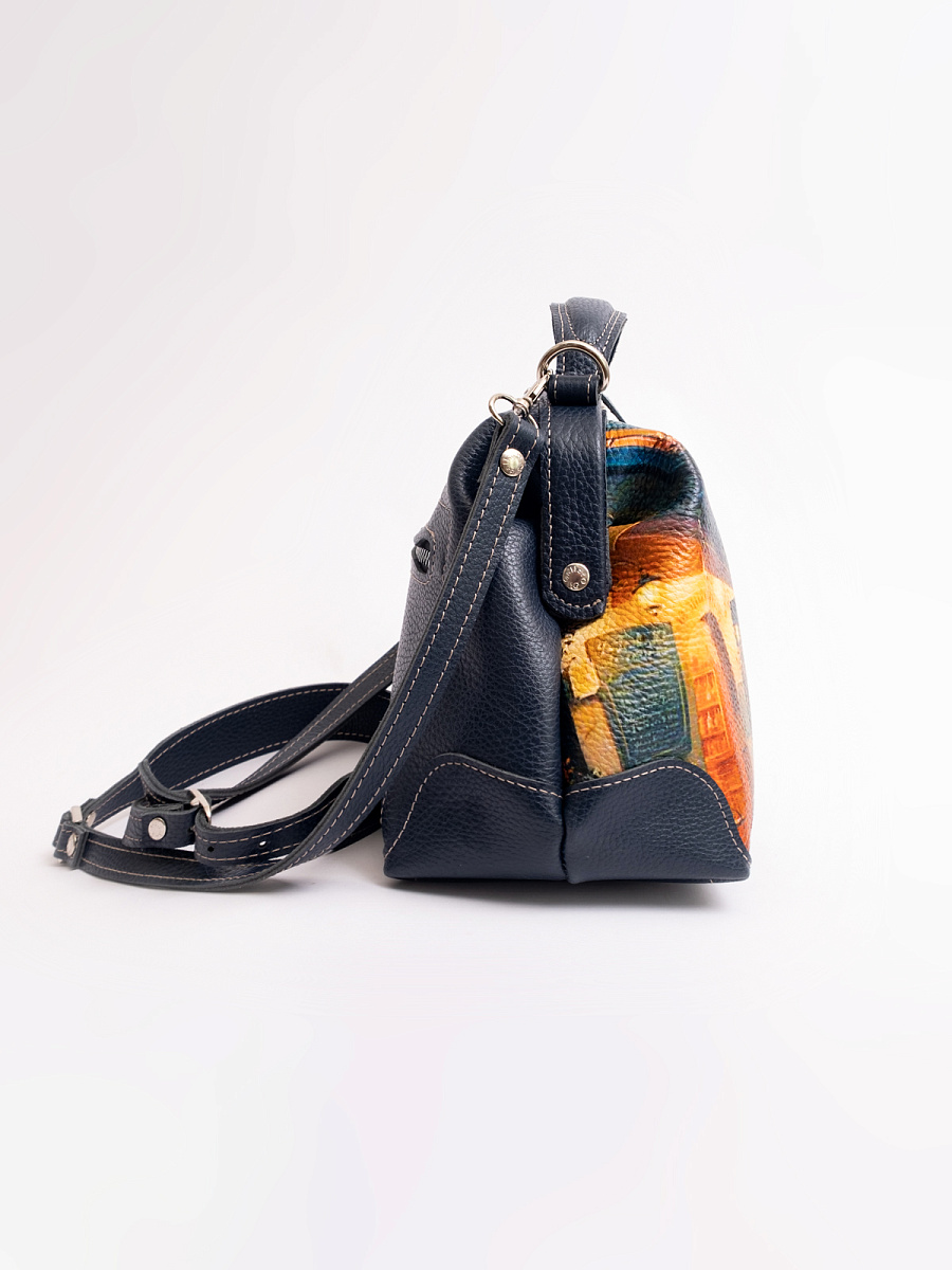 В сумочке имеется одно отделение, в которое легко уместятся все женские нужности, так же внутри есть открытый карман в котором удобно носить телефон. Дно у сумки мягкое. Благодаря фермуару вход в сумку свободный, с легкостью войдет блокнот формата А 5. Закрывается сумка на кнопку. В комплекте идет ремешок из кожи, который крепится на карабины и регулируется по длине. Длина ремня мин 105 см, максимум 116 см