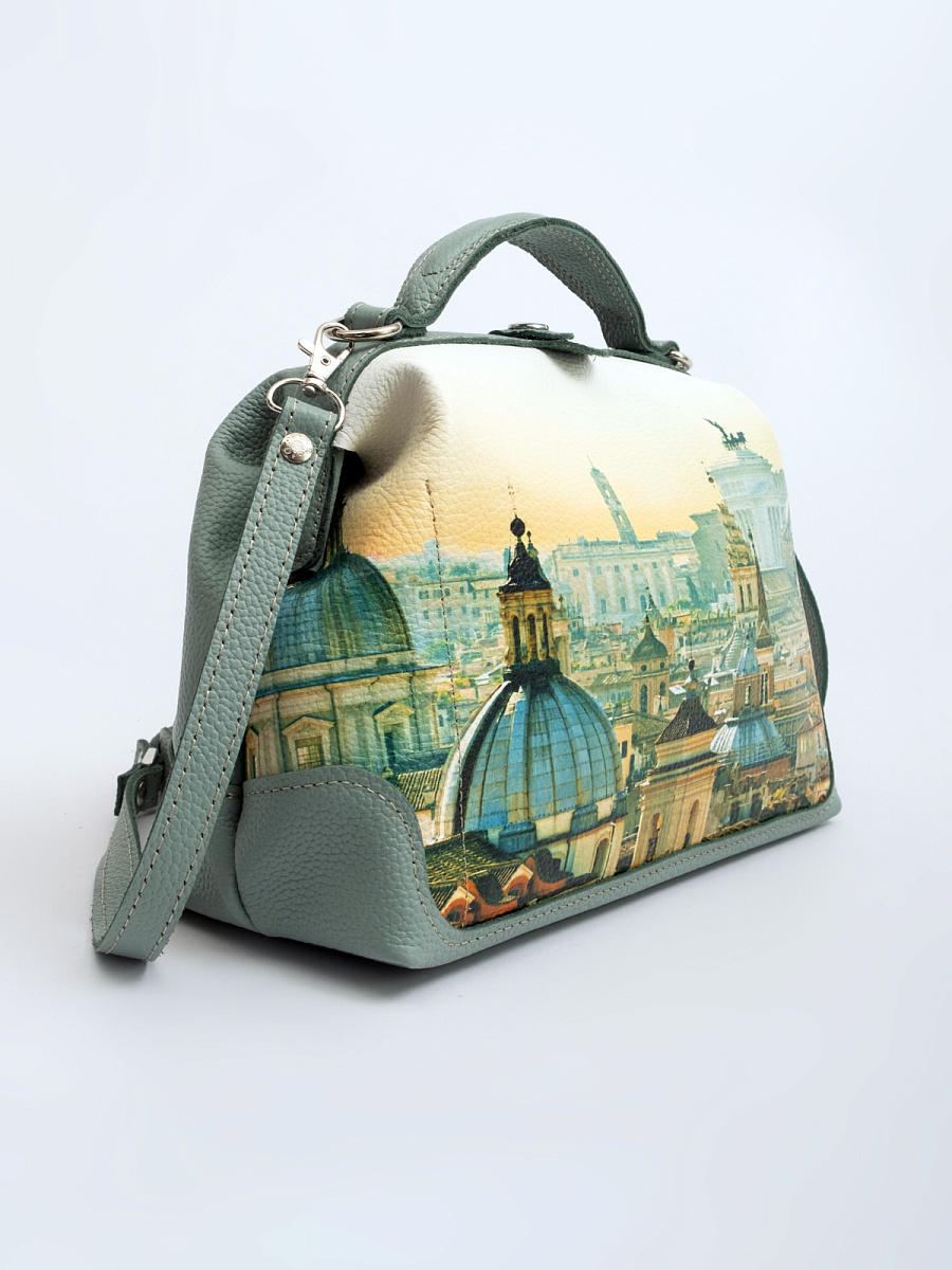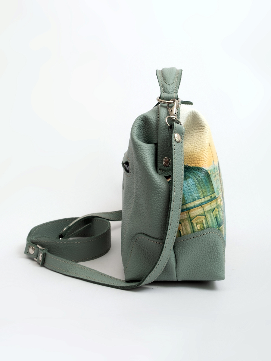 В сумочке имеется одно отделение, в которое легко уместятся все женские нужности, так же внутри есть открытый карман в котором удобно носить телефон. Дно у сумки мягкое. Благодаря фермуару вход в сумку свободный, с легкостью войдет блокнот формата А 5. Закрывается сумка на кнопку. В комплекте идет ремешок из кожи, который крепится на карабины и регулируется по длине. Длина ремня мин 105 см, максимум 116 см