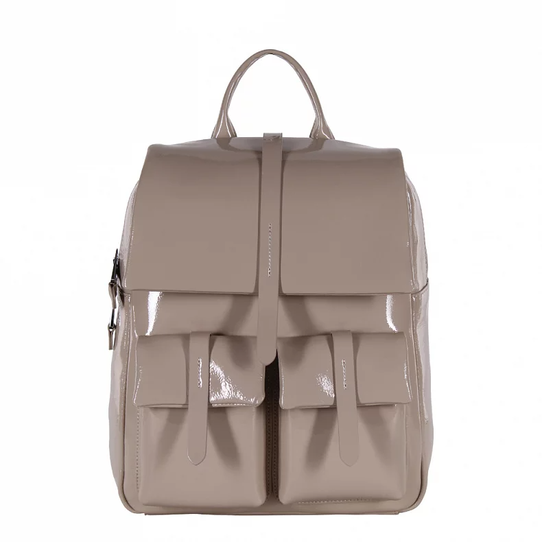 Классическая модель рюкзака, выполнен из натуральной лаковой кожи.  Дополнен серебристой фурнитурой. Данная модель закрывается на клапан, носится на плече или в руке. Встроенные ремни регулируются по длине. Так же имеется ручка. Каркас полужесткий.