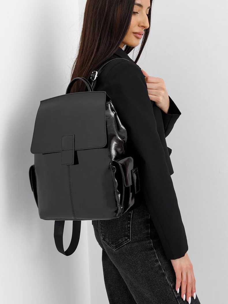 Удобный рюкзак, выполнен из натуральной лаковой кожи. Дополнен серебристой фурнитурой. Данная модель закрывается на клапан. Каркас полужесткий. Рюкзак носится в руке или на плече. Встроенный ремни регулируются по длине.