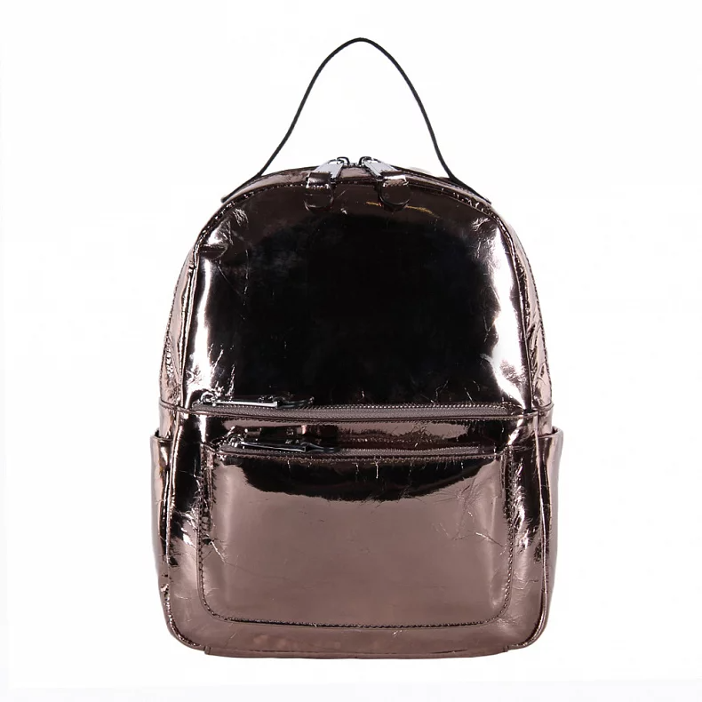 Рюкзак классический, выполнен из натуральной лаковой кожи. Дополнен серебристой фурнитурой. Данная модель закрывается на молнию. Каркас полужесткий. Встроенные ремни регулируются по длине.
