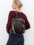Рюкзак-трансформер, выполнен из экокожи. Декорирован логотипом на передней части. Дополнен серебристой фурнитурой. Данная модель закрывается на молнию, носится как сумка за встроенные ручки или на плече, а так же как рюкзак. Съемные ремни перестегиваются и регулируются по длине.