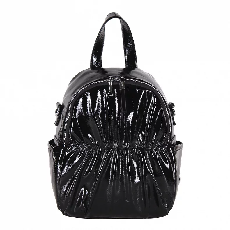 Рюкзак-трансформер, выполнен из экокожи. Декорирован складками на корпусе. Дополнен серебристой фурнитурой. Данная модель закрывается на молнию. Каркас полужесткий. Встроенные ремни регулируются по длине. В комплекте имеется съемный ремень-стропа.