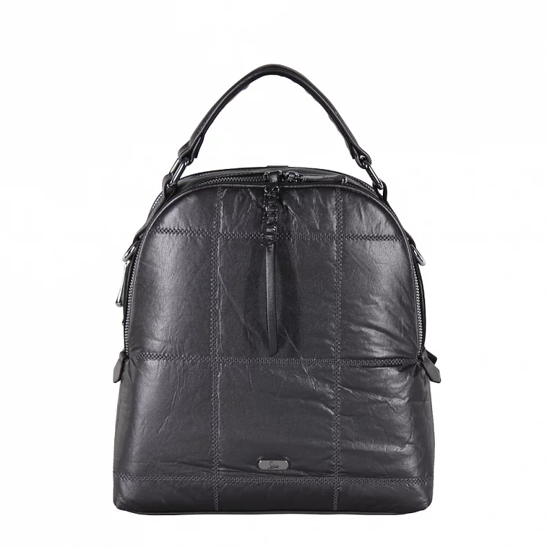 Рюкзак-трансформер, выполнена из экокожи.  Дополнена серебристой фурнитурой. Данная модель закрывается на молнии. Каркас полужесткий. Носится как сумка или как рюкзак. Ремни съемные, так же есть встроенная ручка.