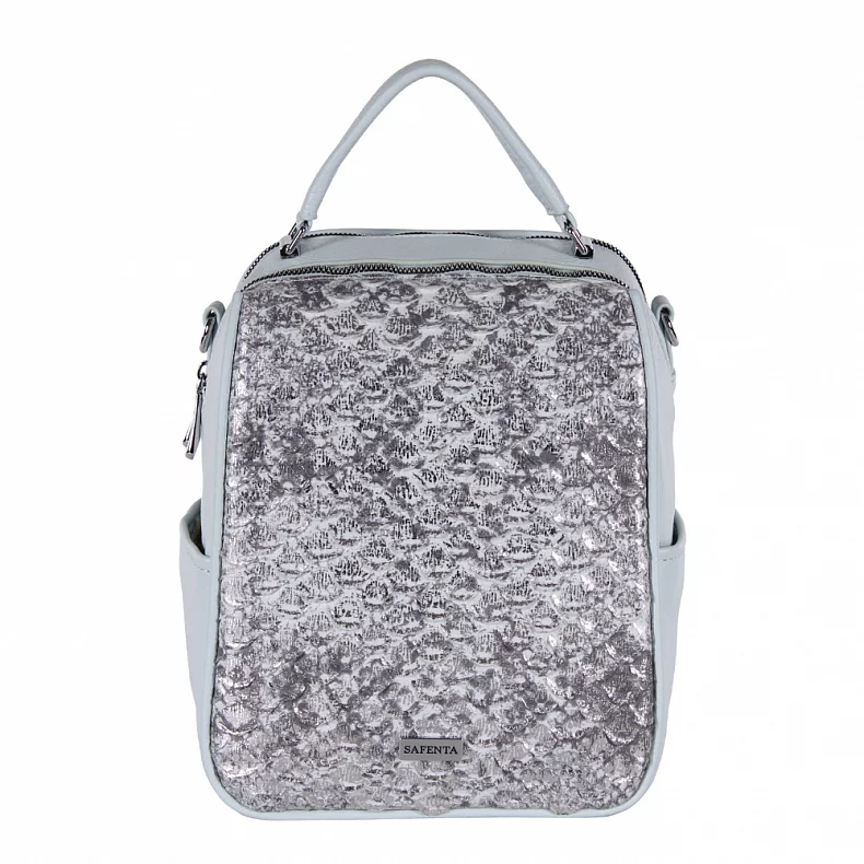 Рюкзак-трансформер, выполнен из экокожи. Декорирован перламутровой отделкой на передней части. Дополнен серебристой фурнитурой. Данная модель закрывается на молнии, носится как сумкf и как рюкзак. В комплекте имеются съемные ремни с регулировкой длины. Каркас полужесткий.