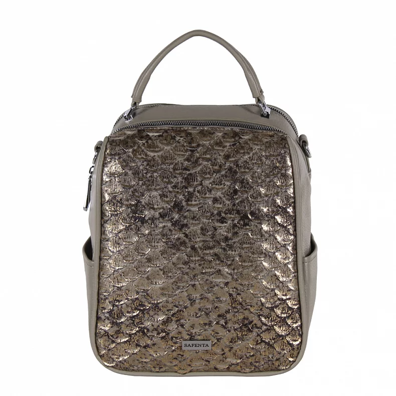 Рюкзак-трансформер, выполнен из экокожи. Декорирован перламутровой отделкой на передней части. Дополнен серебристой фурнитурой. Данная модель закрывается на молнии, носится как сумкf и как рюкзак. В комплекте имеются съемные ремни с регулировкой длины. Каркас полужесткий.