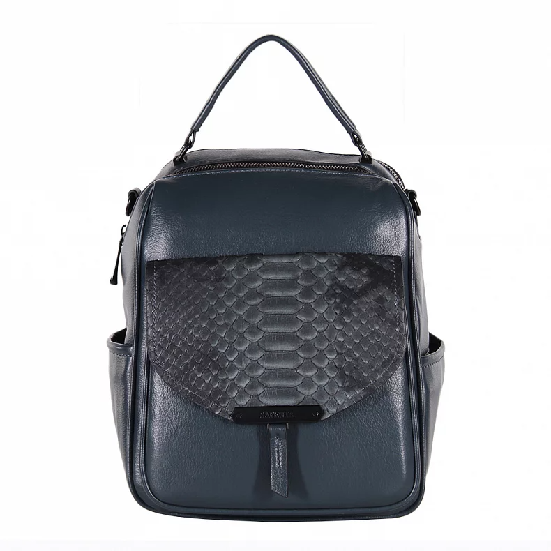Рюкзак-трансформер, из экокожи. Декорирован фактурой на клапане.  Дополнен черной фурнитурой. Данная модель закрывается на молнии. Каркас полужесткий. Носится как сумка или как рюкзак. Ремни съемные.