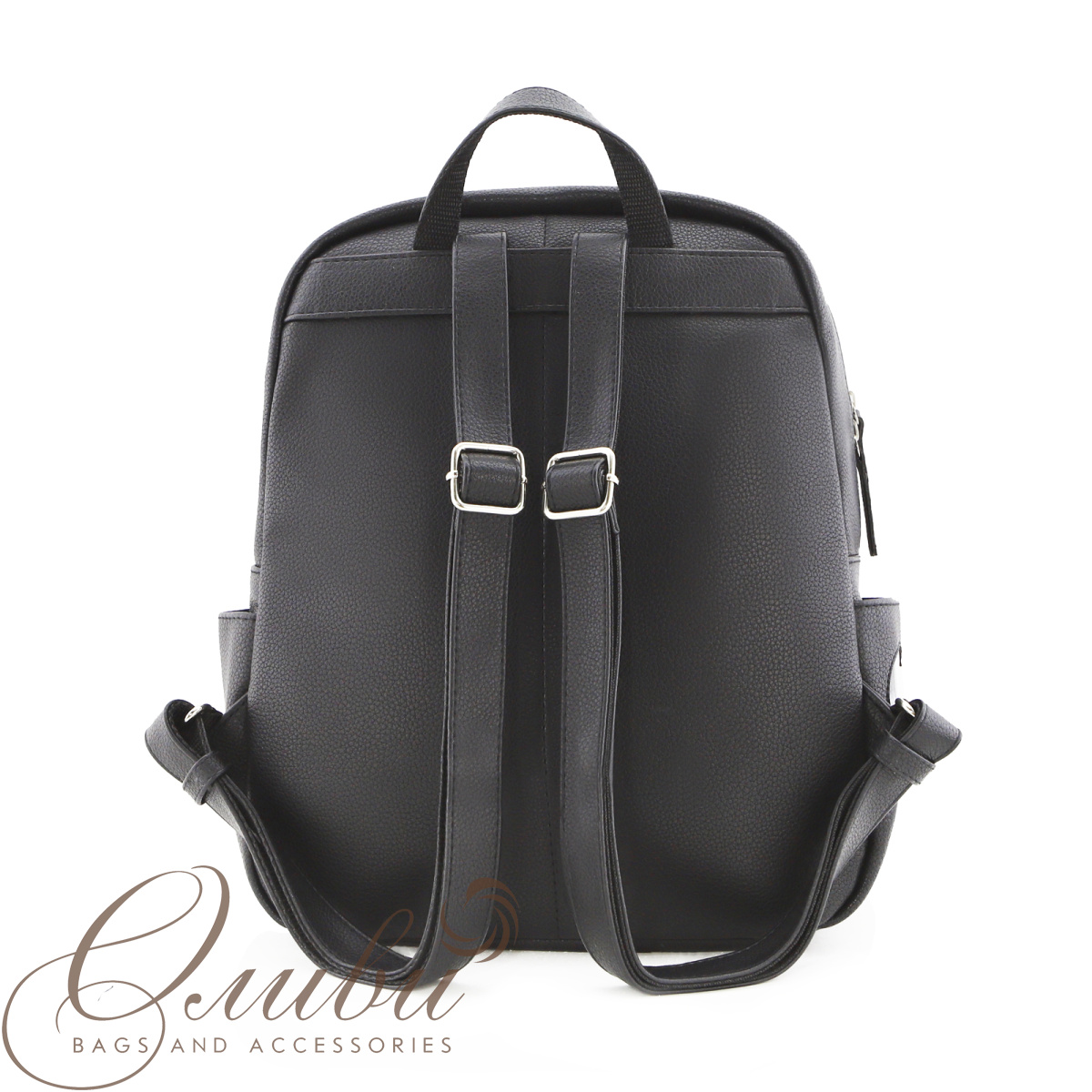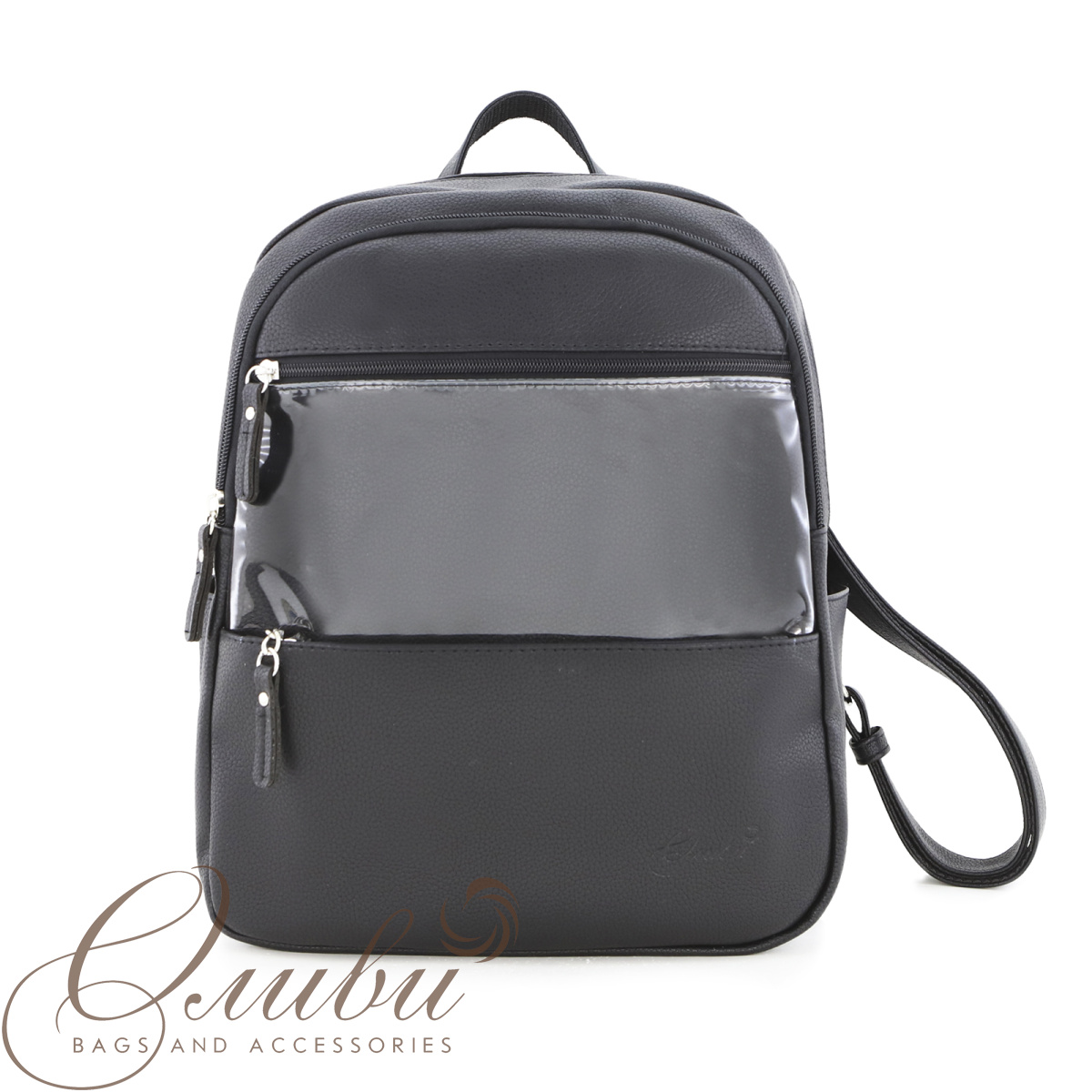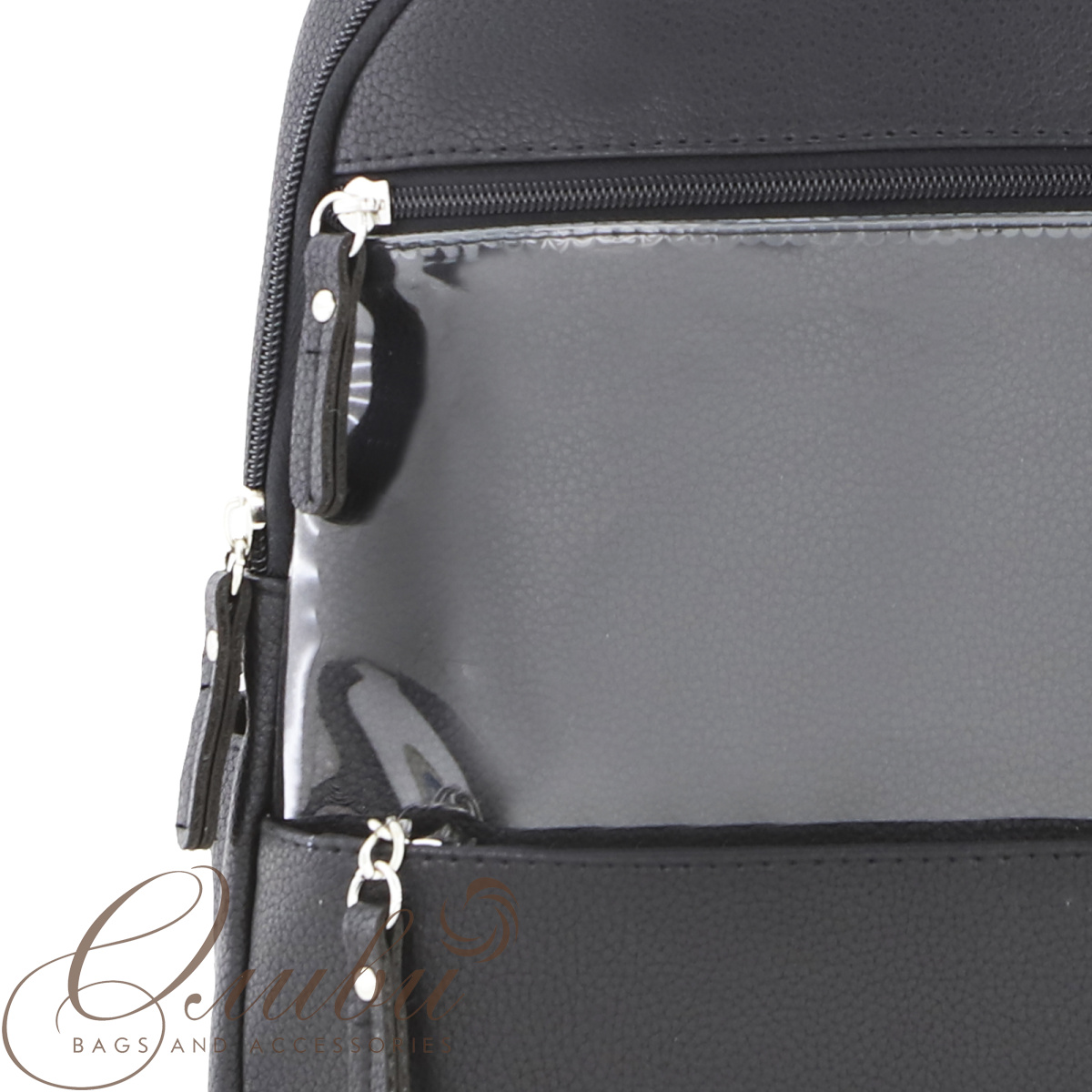 Рюкзак на регулируемых заплечных ремнях и короткой ручке. Формат А4.Два основных отделения на молниях. На передней стенке два кармана на молнии. Внутри: карман для документов с карабином для ключей, карман на молнии, открытый карман. Снаружи два  кармана.