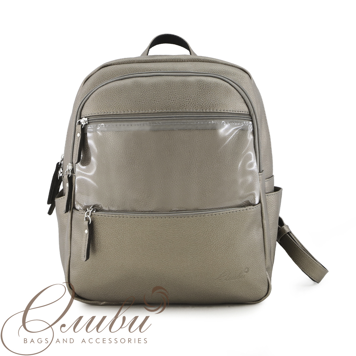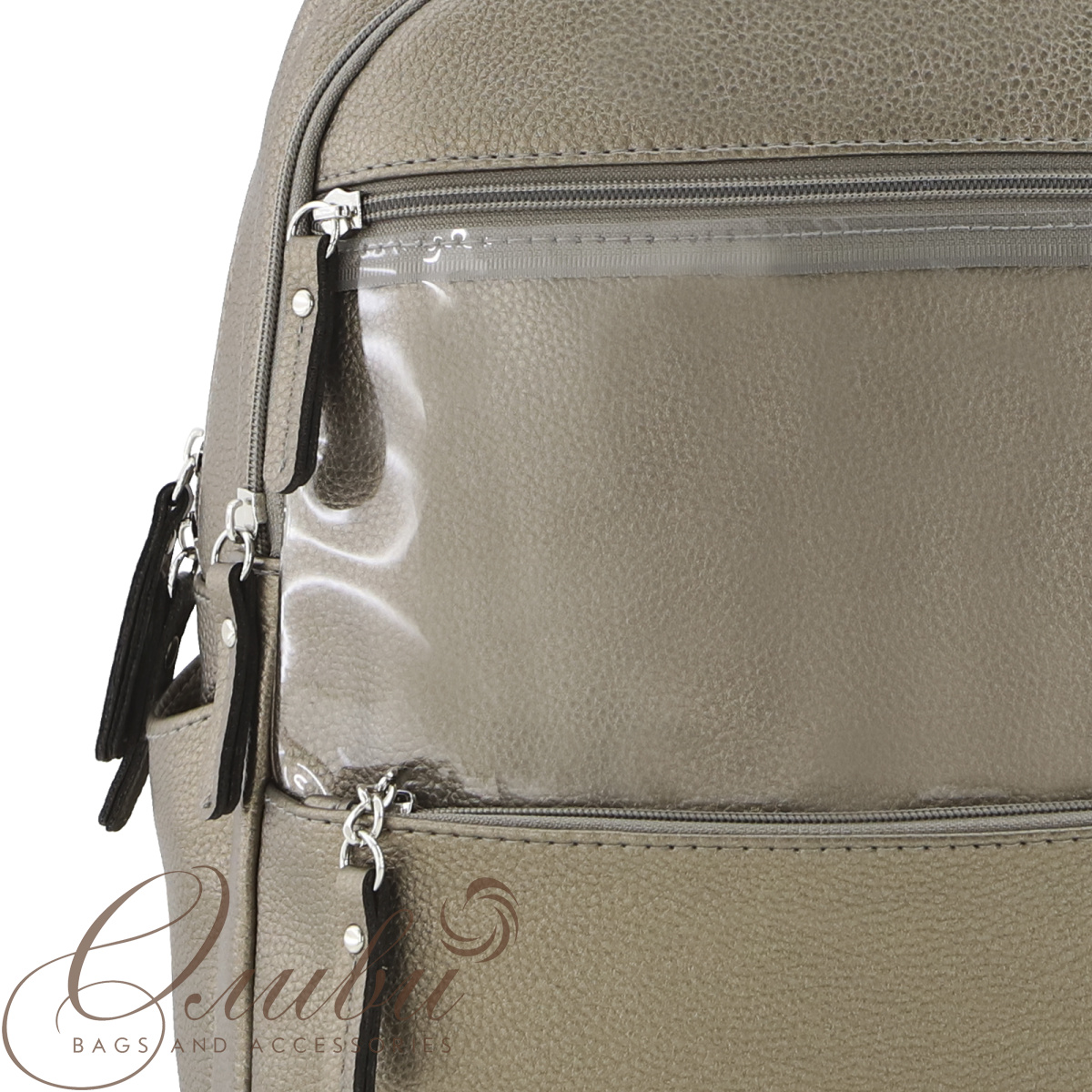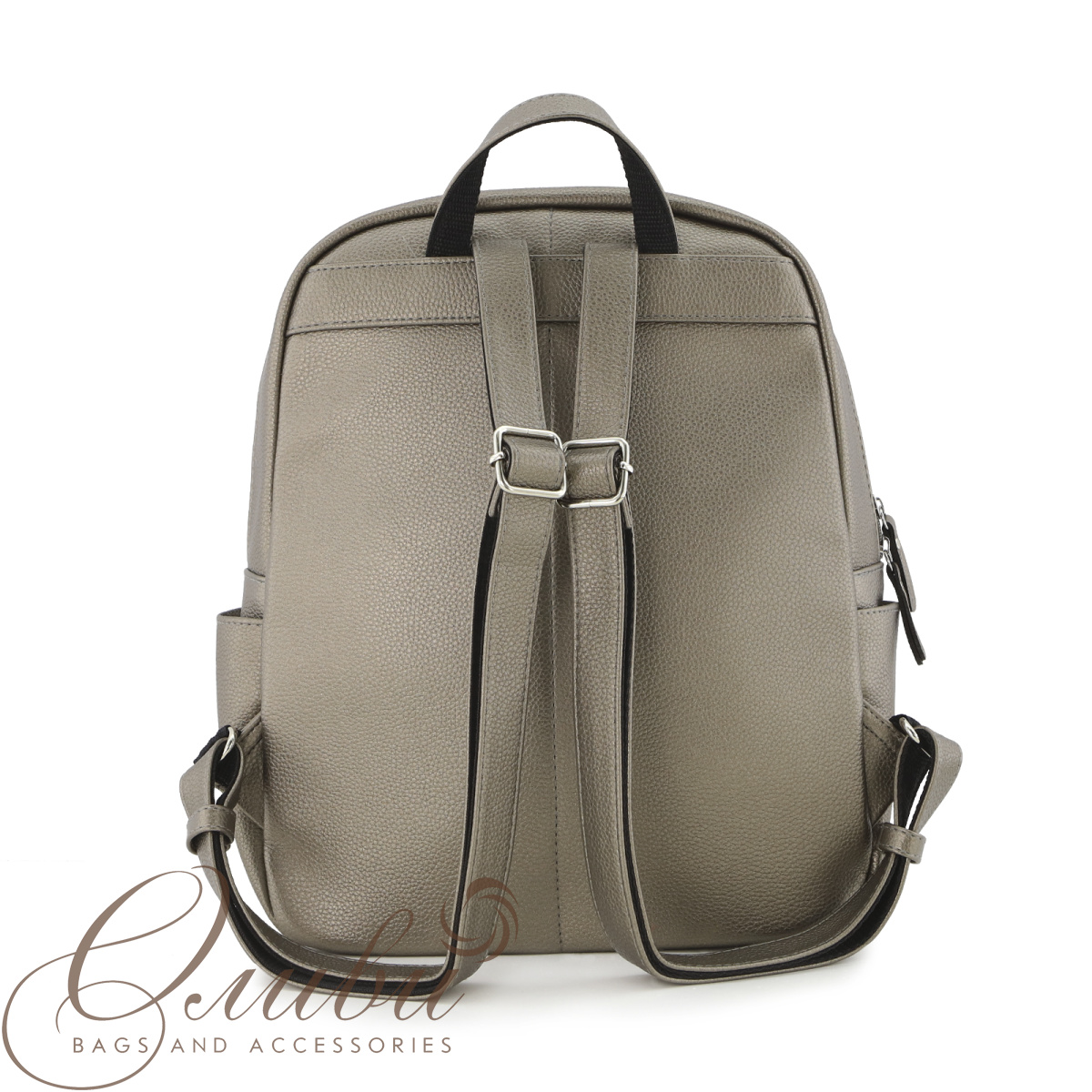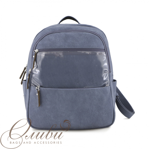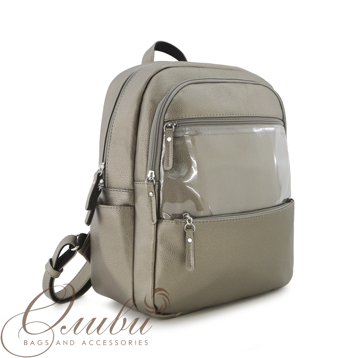 Рюкзак на регулируемых заплечных ремнях и короткой ручке. Формат А4.Два основных отделения на молниях. На передней стенке два кармана на молнии. Внутри: карман для документов с карабином для ключей, карман на молнии, открытый карман. Снаружи два  кармана.