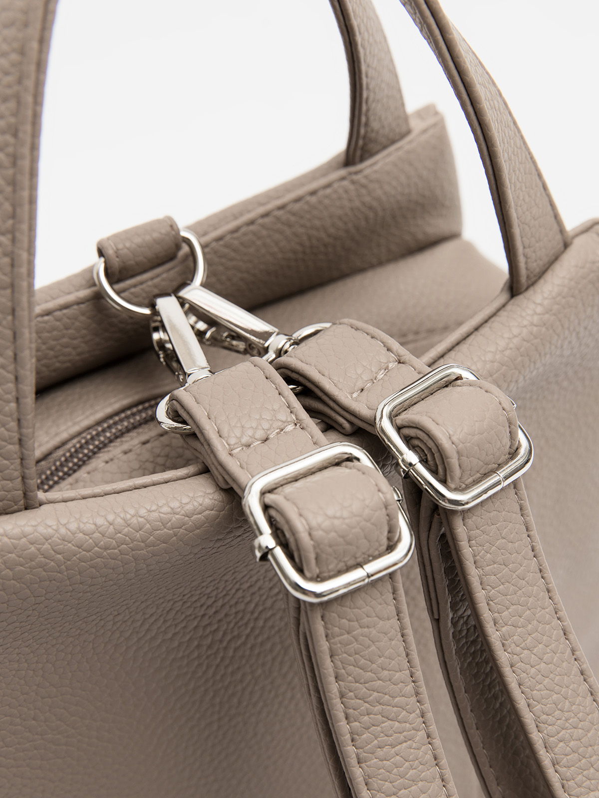 Асимметричная форма с металлическим декором сразу выделяет эту модель. Передний карман со скрытой молнией сохраняет чистые линии, добавляя внешней сдержанности. Объёмный основной отдел и продуманные карманы вместят всё необходимое, сохраняя аккуратный вид.