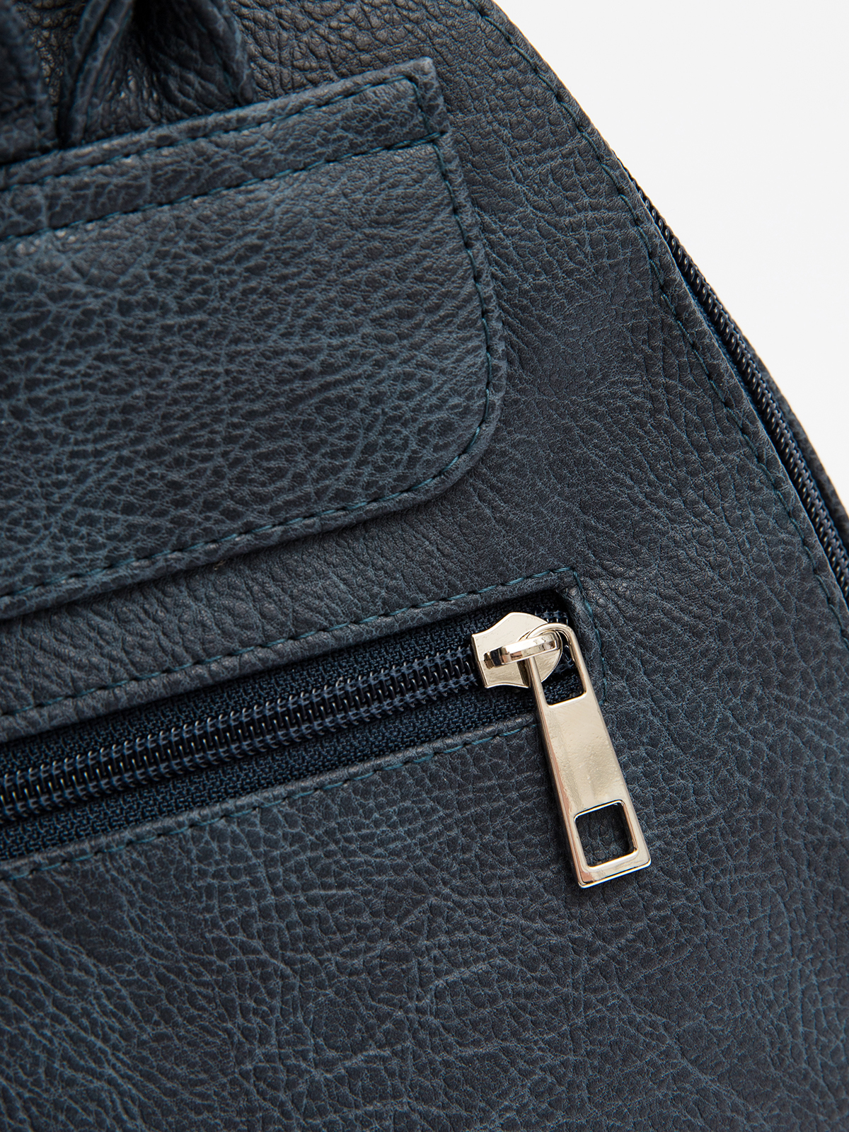 Его выразительную фактуру подчеркивает рельефное тиснение и мягкие складки по бокам, создающие объем без громоздкости. Передние прорезные карманы на спиральной молнии с кожаными наконечниками бегунков добавляют практичности, сохраняя элегантность линий.