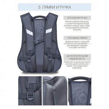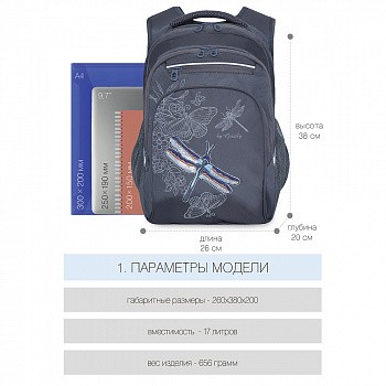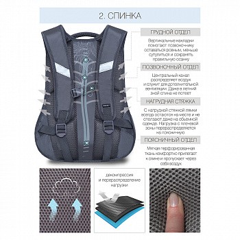 Рюкзак разработан для учащихся начальной и средней школы. Анатомическая спинка, удобные лямки и нагрудная стяжка-фиксатор позволяют равномерно распределять нагрузку на спину и плечи. Материал рюкзака с водо- и грязеотталкивающей пропиткой. Рюкзак очень хорошо оснащен, имеет два вместительных отделения для учебных пособий форматом А4. В основном отделении есть карман для планшета или небольшого ноутбука 13". Дополнительное переднее отделение оснащено съемным держателем для ключей и тремя карманами. Двунаправленные реверсные молнии с брендированными пуллерами на замках позволяют легко открывать и закрывать рюкзак. У рюкзака два внешних кармана на молнии, удобная ручка для переноски и два боковых кармана для бутылочки с водой. Светоотражающие элементы с 4-х сторон обеспечивают дополнительную безопасность. К рюкзаку прилагается обучающая брошюра по программе «GRIZZLY Здоровая Спина».