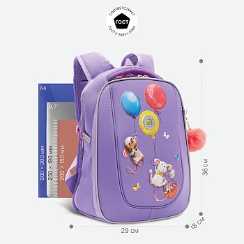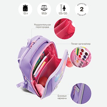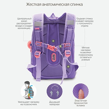 У школьного рюкзака формованная лицевая часть, жесткая анатомическая спинка и жесткое дно на ножках. Содержимое надежно защищено. А еще такая конструкция равномерно распределяет нагрузку на спину. Чтобы не уставали руки и плечи, мы сделали широкие лямки и нагрудную стяжку. Конструкция детской сумки не деформируется при нагрузке и создает надежную защиту содержимого. У школьного рюкзака два отделения. Основное отделение разбито на три отсека: для книг, тетрадей и папок А4, есть карман из сетки на молнии. Дополнительное жесткое отделение не даст помяться ценным вещам. Для безопасности в темное время суток мы добавили со всех сторон светоотражающие элементы. За счет водо- и грязеотталкивающей пропитки ранец долго остается как новый. Если он все же чем-то испачкался, мы рекомендуем ручную стирку в холодной воде.