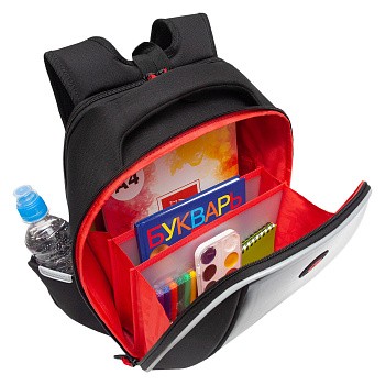 У школьного рюкзака формованная лицевая часть, жесткая анатомическая спинка и жесткое дно на ножках. Содержимое надежно защищено. А еще такая конструкция равномерно распределяет нагрузку на спину. Чтобы не уставали руки и плечи, мы сделали широкие лямки и нагрудную стяжку. Конструкция детской сумки не деформируется при нагрузке и создает надежную защиту содержимого. У школьного рюкзака два отделения. Основное отделение разбито на три отсека: для книг, тетрадей и папок А4, есть карман из сетки на молнии. Дополнительное жесткое отделение не даст помяться ценным вещам. Для безопасности в темное время суток мы добавили со всех сторон светоотражающие элементы. За счет водо- и грязеотталкивающей пропитки ранец долго остается как новый. Если он все же чем-то испачкался, мы рекомендуем ручную стирку в холодной воде.