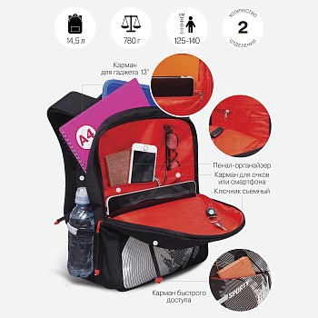 Детский ранец очень вместительный - внутри помещается все, что может понадобиться в школе: от крупных и не очень учебников, рабочих тетрадей до канцелярии и всяких полезных мелочей. Есть два больших отделения: одно для книг, документов и пособий формата А4, другое для принадлежностей. Много карманов внутри и снаружи, карман для ноутбука 13", так же сетчатый карман с замком для смартфона или очков.