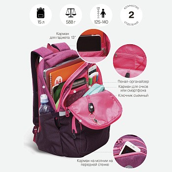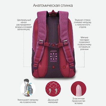 Мы знаем, что в молодежных женских рюкзаках GRIZZLY для повседневного использования вы цените вместительность, легкость и практичность. Рюкзак рассчитан на рост от 150 cм. В женском рюкзаке два основных отделения: большое для крупных вещей, книг, тетрадей и папок А4 и поменьше для принадлежностей. Внутри 5 карманов, включая карман для ноутбука 15”, пенал и брелок для ключей. Снаружи два кармана для мелочей. Боковые кармашки для воды. Все что вам нужно лежит на своих местах. Чтобы разгрузить позвоночник, мы сделали анатомическую спинку с накладками. Она снижает нагрузку и сохраняет вашу осанку. Материал повседневного рюкзака — плотный полиэстер, который хорошо держит форму. За счет водо- грязеотталкивающей пропитки он меньше пачкается и долго остается как новый. Если рюкзак все же чем-то испачкался, мы рекомендуем ручную стирку в холодной воде. С уважением, команда GRIZZLY