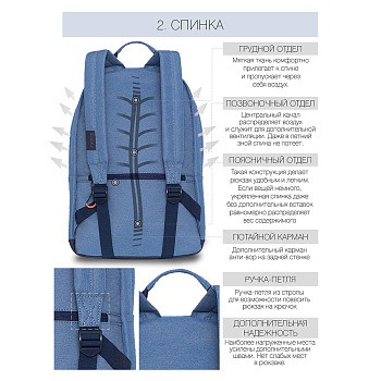 Стильный и легкий  городской рюкзак GRIZZLY для прогулок и  путешествий, отдыха и спорта, работы и магазина, школы и  института. Этот эргономичный городской рюкзак продуман до мелочей. Он имеет одно вместительное основное отделение с карманом для планшета или небольшого ноутбука 15" и  дополнительные карманы.  Большой накладной карман спереди с дополнительным плоским карманом на молнии, карман быстрого доступа для мелочей в верхней части рюкзака с держателем для ключей на фастексе, секретный карман на молнии на спине, а также два боковых кармана. Рюкзак GRIZZLY имеет удобную укрепленную спинку, регулируемые мягкие лямки и ручку для переноски, обшитую тканью. Материал рюкзака с водо- и грязеотталкивающей пропиткой. Двунаправленные реверсные молнии с брендированными пуллерами на замках позволяют легко открывать и закрывать рюкзак.  Рюкзак имеет прочную и грязеотталкивающую фирменную подкладку GRIZZLY.