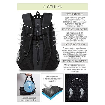 Для вещей предусмотрено два основных отделения. Одно для книг, тетрадей и папок (А4). Второе для принадлежностей. Есть 5 внутренних кармашков для канцелярии. Карман для гаджетов до 15”. Плюс один большой внешний карман и 3 маленьких для документов, ключей, кошелька и т.д. Боковые сетчатые кармашки для воды и перекуса. Дополнительно носить пакет с собой больше не нужно. Все помещается в рюкзаке.