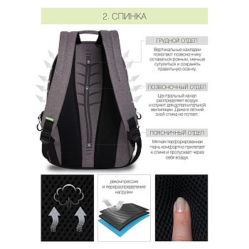 Здесь два основных отделения. Большое для книг, тетрадей или обуви и спортивной формы. Поменьше — для документов и принадлежностей. Много кармашков: два фронтальных, два боковых, внутренние для мелочей, ноутбука и карман-органайзер.
