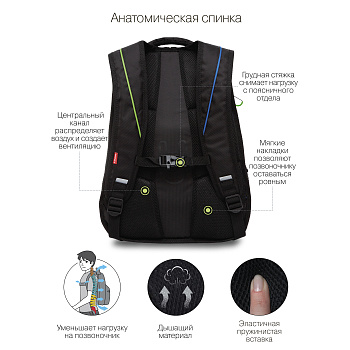 В рюкзаке общим объемом 20 л три полноценных отделения: для книг, документов А4, принадлежностей или сменки, в том числе есть отделение для ноутбука до 15” Предусмотрено много кармашков: 2 боковых, 3 снаружи и 3 внутри. В такой рюкзак помещается много вещей. Дно твердое, рюкзак не будет провисать. Чтобы уменьшить нагрузку на спину, мы предусмотрели анатомическую спинку с поддержкой позвоночника, лямки особой формы и нагрудную стяжку со свистком. Нагрузка распределяется по поверхности, подростки меньше устают и сохраняется здоровой осанка. Для безопасности установили со всех сторон светоотражатели.