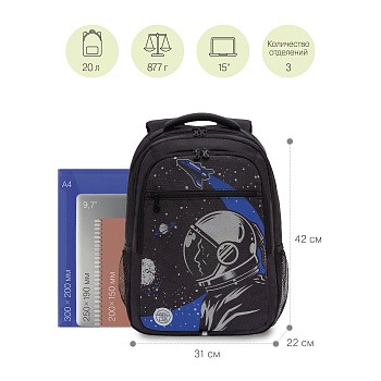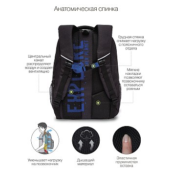 В рюкзаке общим объемом 20 л три полноценных отделения: для книг, документов А4, принадлежностей или сменки, в том числе есть отделение для ноутбука до 15” Предусмотрено много кармашков: 2 боковых, 3 снаружи и 3 внутри. В такой рюкзак помещается много вещей. Дно твердое, рюкзак не будет провисать. Чтобы уменьшить нагрузку на спину, мы предусмотрели анатомическую спинку с поддержкой позвоночника, лямки особой формы и нагрудную стяжку со свистком. Нагрузка распределяется по поверхности, подростки меньше устают и сохраняется здоровой осанка. Для безопасности установили со всех сторон светоотражатели.