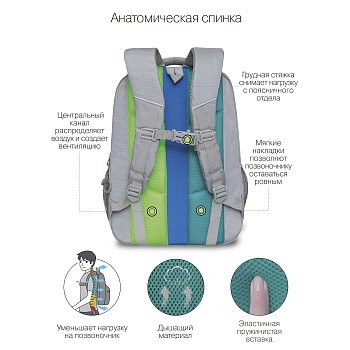 В рюкзаке общим объемом 20 л три полноценных отделения: для книг, документов А4, принадлежностей или сменки, в том числе есть отделение для ноутбука до 15” Предусмотрено много кармашков: 2 боковых, 3 снаружи и 3 внутри. В такой рюкзак помещается много вещей. Дно твердое, рюкзак не будет провисать. Чтобы уменьшить нагрузку на спину, мы предусмотрели анатомическую спинку с поддержкой позвоночника, лямки особой формы и нагрудную стяжку со свистком. Нагрузка распределяется по поверхности, подростки меньше устают и сохраняется здоровой осанка. Для безопасности установили со всех сторон светоотражатели.