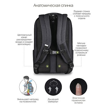 У рюкзака анатомические спинка и лямки. Есть нагрудная стяжка со свистком. Благодаря поддержке позвоночника, меньше устает спина. Светоотражающие элементы с четырех сторон создают дополнительную безопасность в условиях недостаточной видимости.