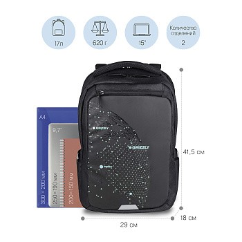 Общий объем (17 л) разделен на два отделения. Одно подходит для крупных вещей. Второе плоское — для ноутбука до 15” и документов формата А4 в папке. В кармашки можно класть различные мелочи. Есть 3 кармана снаружи и 2 внутри. Помещаются все необходимые вещи.