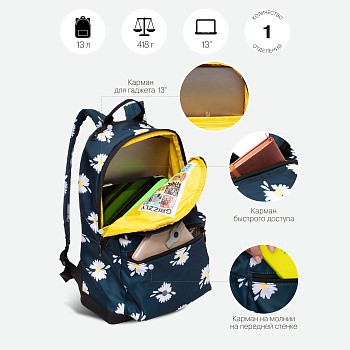Небольшой стильный и легкий городской рюкзак GRIZZLY для прогулок и путешествий, отдыха и спорта, работы и магазина, школы и института. Этот эргономичный городской рюкзак рассчитан на рост от 150 см. Имеет одно вместительное основное отделение с карманом для папок формата А4 и ноутбука 13" и карман быстрого доступа в верхней части рюкзака. У рюкзака большой накладной карман спереди, удобная укрепленная спинка, регулируемые мягкие лямки и ручка для переноски. Материал рюкзака с водо- и грязеотталкивающей пропиткой. Если же рюкзак все же чем-то испачкали, мы рекомендуем ручную стирку в холодной воде. Двунаправленные реверсные молнии с брендированными пуллерами на замках позволяют легко открывать и закрывать рюкзак. Рюкзак имеет прочную и грязеотталкивающую фирменную подкладку GRIZZLY.
