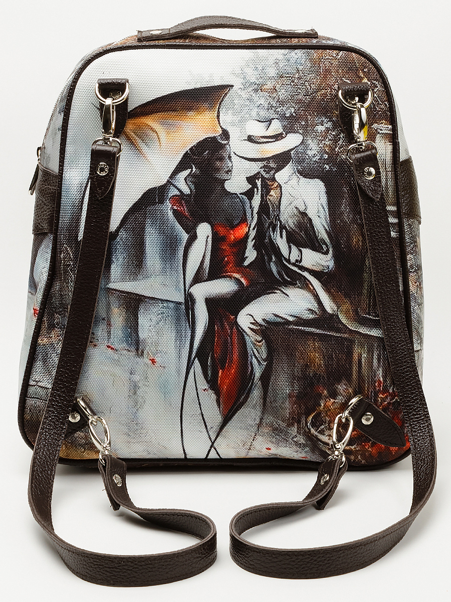 Современная, удобная, сумка-рюкзак выполнена из текстиля, с ручками и отделкой из натуральной кожи, внутри есть 4 кармана для мелочей, один из них на молнии. Удобная для переноски документов формата А4, легкая, проста в уходе. Ткань не линяет.  Сумки торговой марки Gallato сделаны из армированного нейлона с водоотталкивающей полиуретановой пропиткой. Каждый принт выполнен индивидуально. На дне рюкзака есть  "ножки".  Ручки оснащены карабинами, что позволяет быстро и без хлопот превратить вашу сумку в удобный рюкзак. Лямки рюкзака  можно  уменьшить, перестегнув карабины крест-накрест.