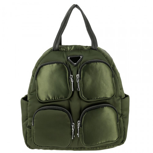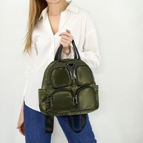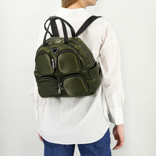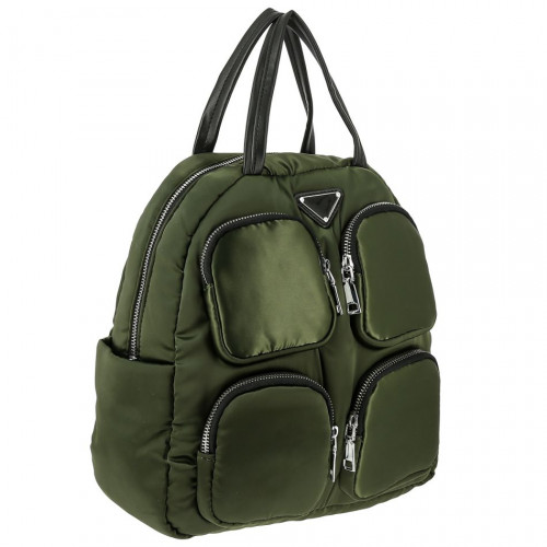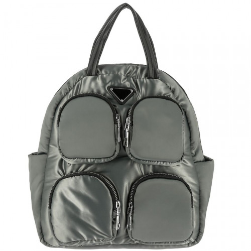 Внутри: одно большое отделение с карманами на боковых стенках: один на молнии и два открытых. С внешней стороны на лицевой стенке четыре накладных кармана на молнии. По бокам два открытых кармашка. Лямки регулируются по высоте. Сумка-рюкзак закрывается на молнию.