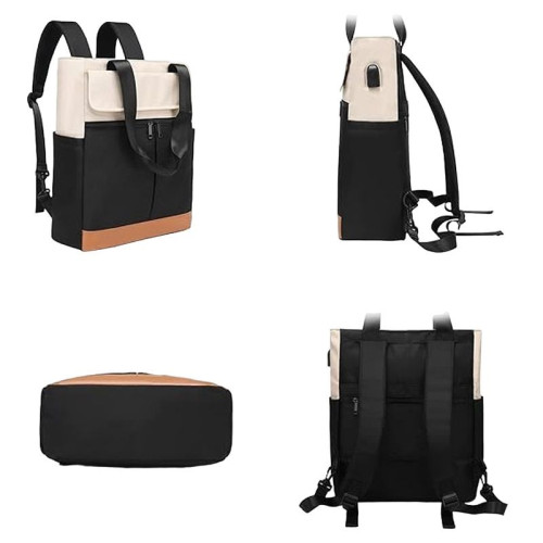 Внутри: одно большое отделение, по бокам которого расположен карман на молнии и карман без молнии для планшета, ноутбука, документов и различных мелочей. На внешней передней стенке расположено два кармана на молнии и один карман без молнии, закрывающийся на крышку-клапан. На внешней задней стенке расположен карман на молнии. Лямки регулируются по высоте. Рюкзак можно носить как сумку. В комплекте есть USB шнур.