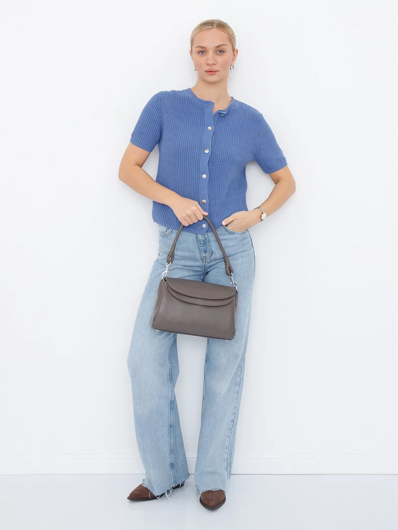 Базовая модель, выполнена из натуральной кожи. Дополнена серебристой фурнитурой. Данная модель закрывается на клапан, носится в руке за съемную ручку. Или на плече, в комплекте имеется ремень с регулировкой длины. Каркас полужесткий. На дне предусмотрены ножки.