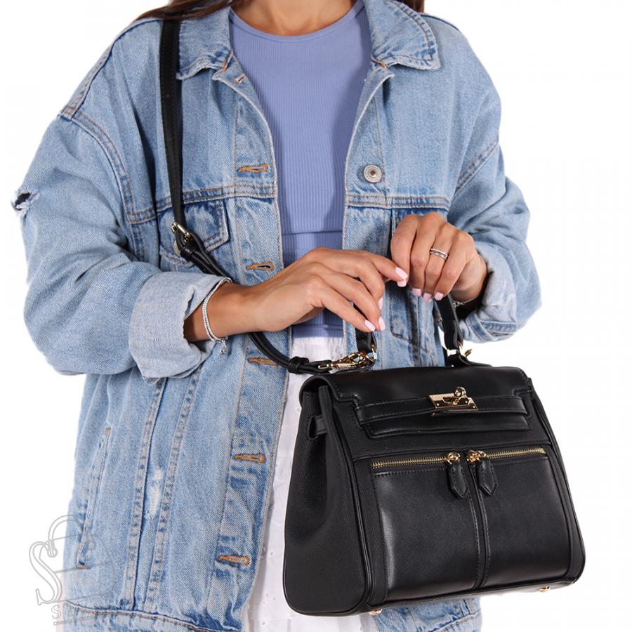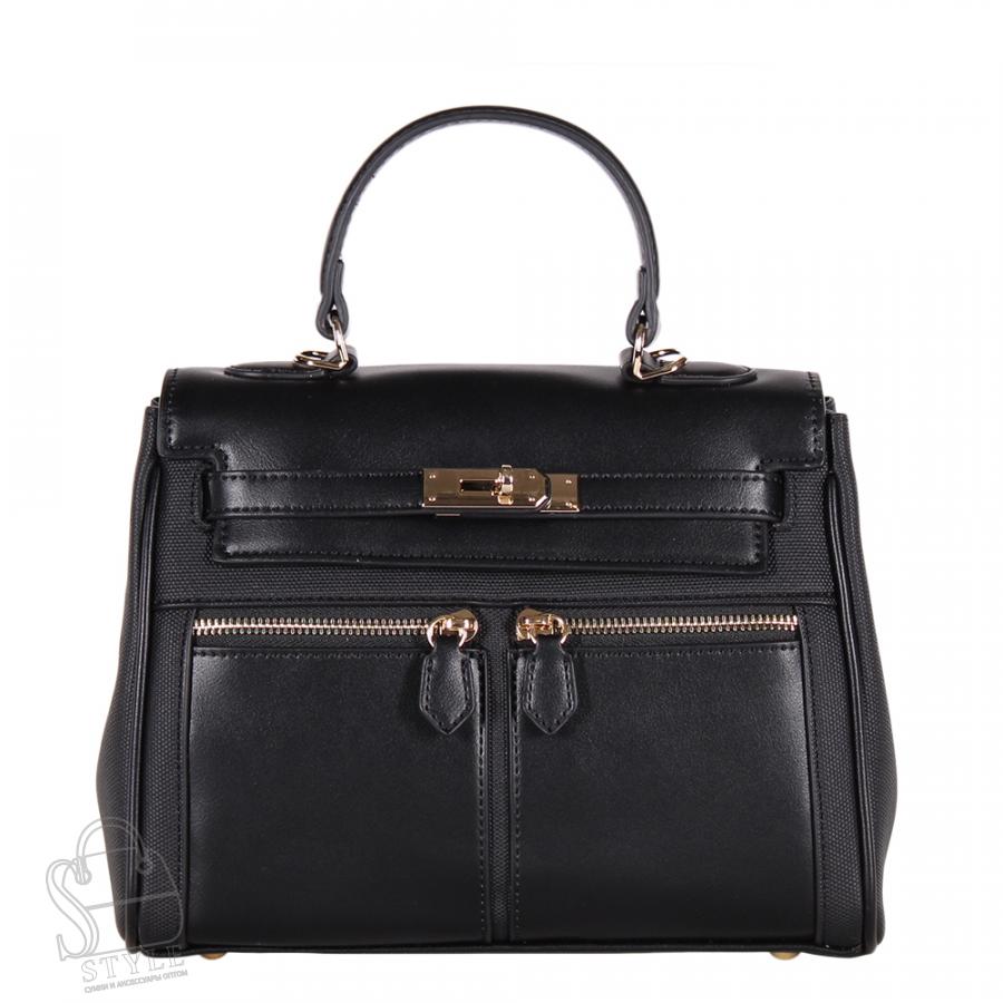 Сумка-сэтчел, выполнена из  экокожи В размере макси. Декорирована эффектной застежкой на передней части. Дополнена золотистой фурнитурой. Данная модель закрывается на клапан. Каркас полужесткий. Носится в руке за встроенную ручку или на плече. В комплекте есть ремень с регулировкой длины. На дне предусмотрены ножки.